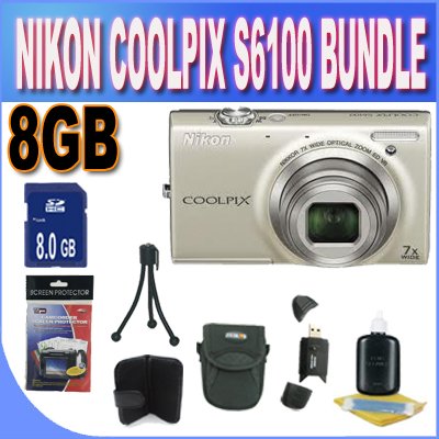 You Save : 34% Nikon COOLPIX S6100 16 MP Digital Camera with 7x NIKKOR Wide-Angle Optical Zoom Lens and 3-Inch Touch-Panel LCD (Silver)+ 8GB SDHC Memory + SDHC Memory Card Wallet + Shock Proof Case w/Strap + USB Card Reader + Mini Tripod + Accessory Saver Bundle! Kit Includes!